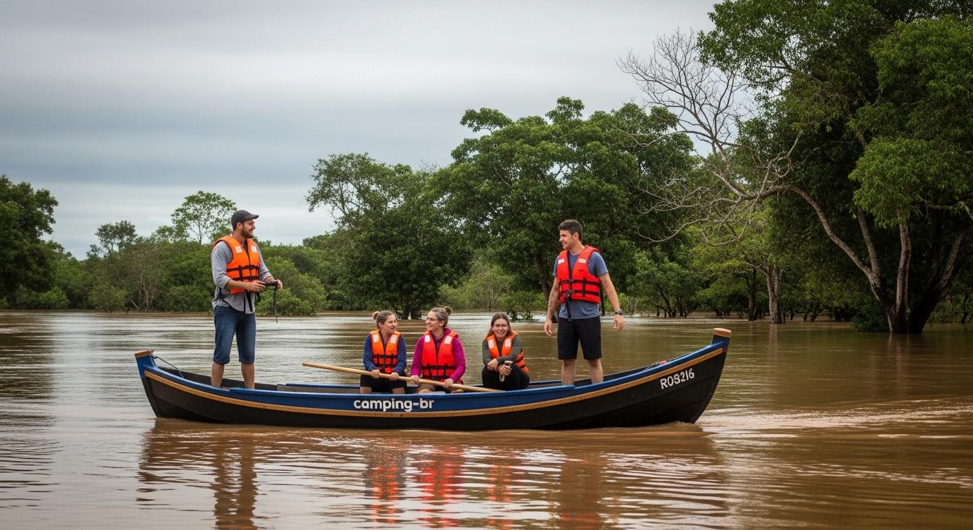Flooded campsite in Brazil with rising water near tents and misty forest background.